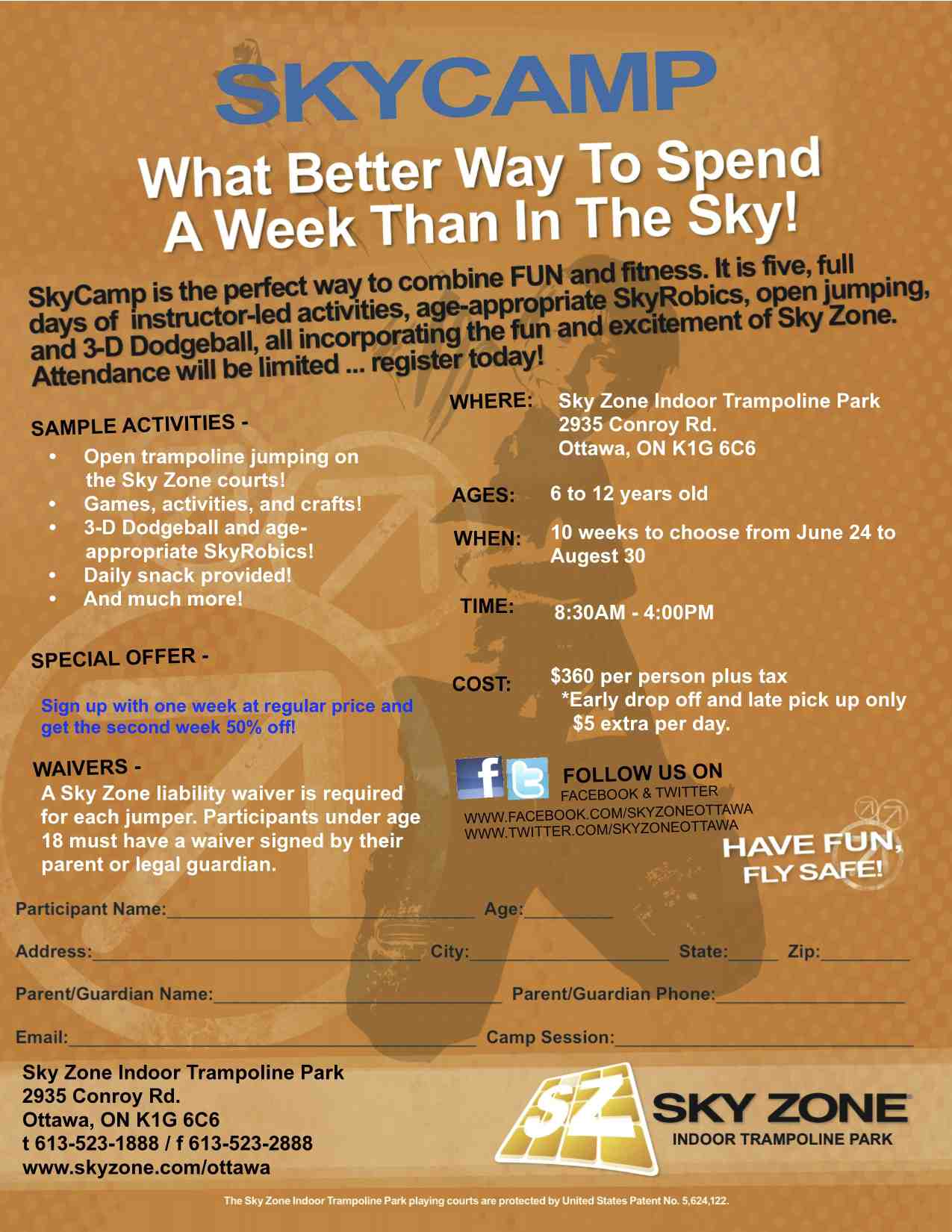 SkyCamp is the perfect way to combine fun and fitness. It is five, full days of instructor-led activities, age-appropriate SkyRobics, open jumping, and 3-D dodgeball, all incorporating the fun and excitement of Sky Zone. Attendance will be limited...register today!